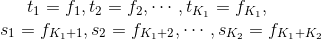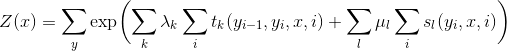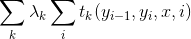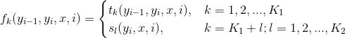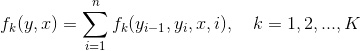 可以看出外面那个求和号是套着里面的求和号的,这种双重求和就表明了对于同一个特征$k$,在各个位置$i$上都有定义。 基于此,很直觉的想法就是把同一个特征在各个位置$i$求和,形成一个全局的特征函数,也就是说让里面那一层求和号消失。在此之前,为了把加号的两项合并成一项,首先将各个特征函数$t$(设其共有$K_1$个)、$s$(设共$K_2$个)都换成统一的记号$f$ :