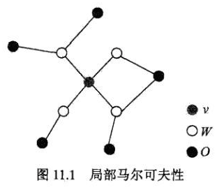 - 局部马尔可夫性:设$v\in V$是$G$中任意一个节点,$W$是与$v$有边连接的所有节点,$O$是$v$,$W$以外的其他所有节点。$v$表示的随机变量是$Y_v$,$W$表示的随机变量是$Y_w$,$O$表示的随机变量是$Y_o$。局部马尔可夫性是在给定随机变量组$Y_w$的条件下随机变量$Y_v$与随机变量$Y_o$是独立的。$$P(Y_v,Y_O|Y_W)=P(Y_v|Y_w)P(Y_O|Y_W)$$