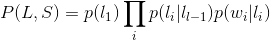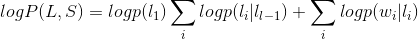 其中$w_i$为$S$中第$i$个词,$l_i$为第$i$个词的标签,公式中前半部分为状态转移概率,后半部分为发射概率。我们用对数形式表示该式: