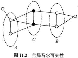 - 全局马尔可夫性:$A,B$是$G$中被C分开的任意节点集合。全局马尔科夫性是指给定$Y_c$条件下$Y_A$和$Y_B$是条件独立的,即$$P(Y_A,Y_B|Y_C)=P(Y_A|Y_C)P(Y_B|Y_C)$$