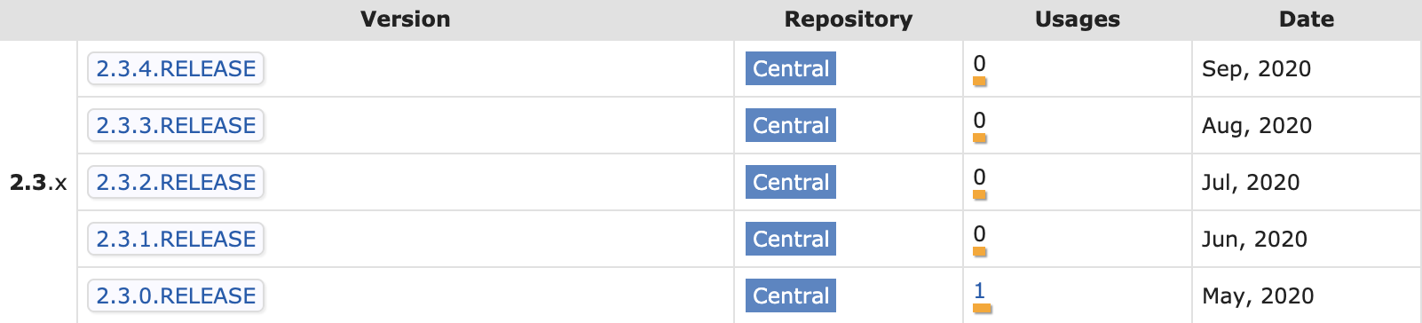 从 Maven 中央仓库来看,Spring Boot 2.3 系列被引用率非常低啊,基本没什么用。