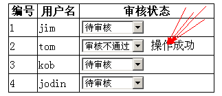 简单的思路:用jquery.post也好xmlhttprequest.open也好,当管理员对某一行的审核状态进行修改的时候,收集用户编号和修改后的审核状态,发送给后台,后台将处理的结果反馈回来,当前端得到后台的反馈之后,执行事先定义的回调函数,进行相应的提示操作: