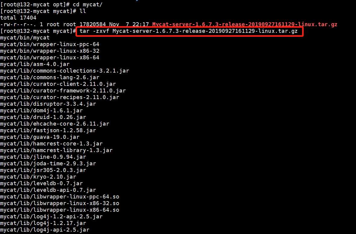 上传至服务器并解压, tar -zxvf Mycat-server-1.6.7.3-release-20190927161129-linux.tar.gz