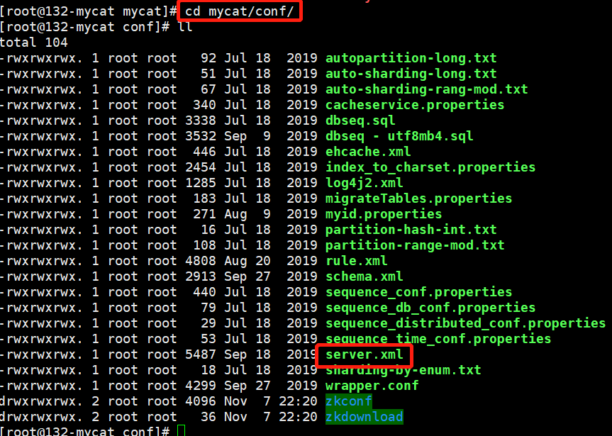 进入config目录, 修改配置server.xml配置文件 cd mycat/conf/