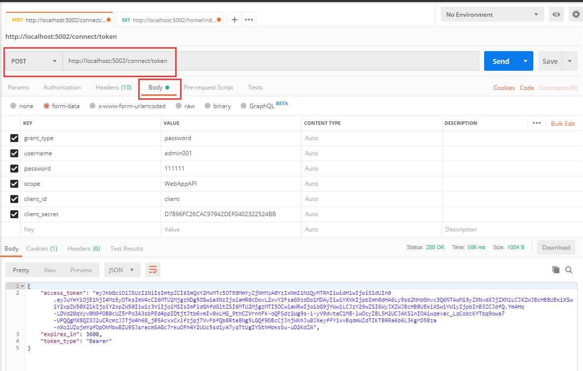 12,运行起来,获取token的地址是:http://localhost:5002/connect/token,这是一个标准的获取token接口,无论域名时什么,地址是不变的。