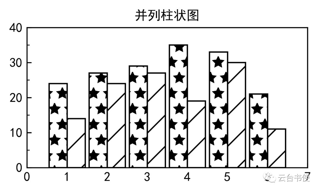 一般绘制图片时,选取在色盘上成对角关系的颜色,打印成黑白的照片后仍然可以清晰的分辨每种柱体;或者使用前面提到的关键字参数hatch来改变内部填充样式分辨柱体。