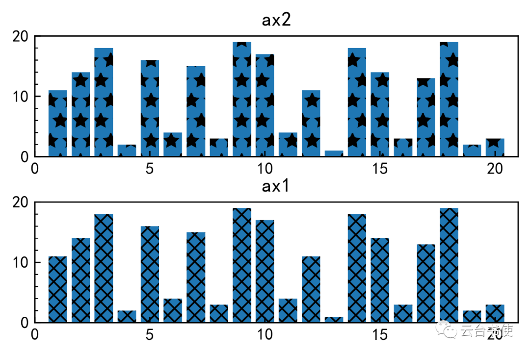 ax1.bar(x,y,hatch='xxx')ax2.bar(x,y,hatch='*')