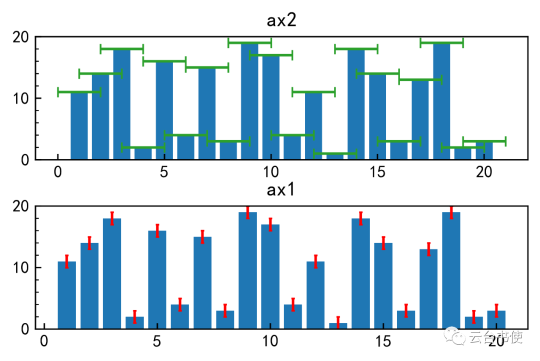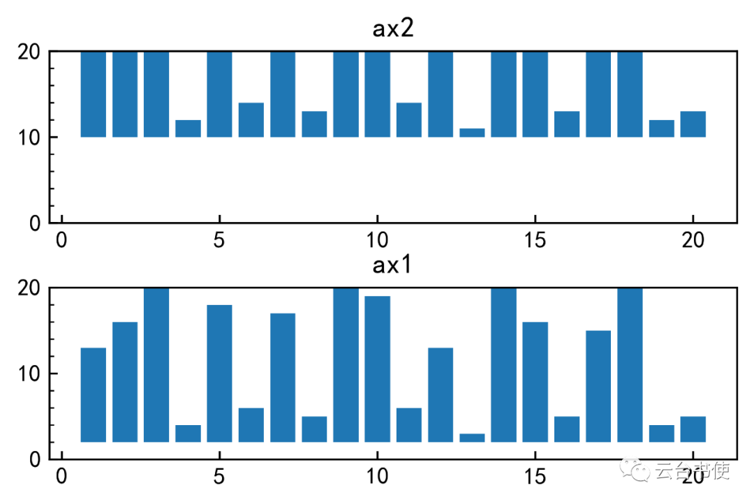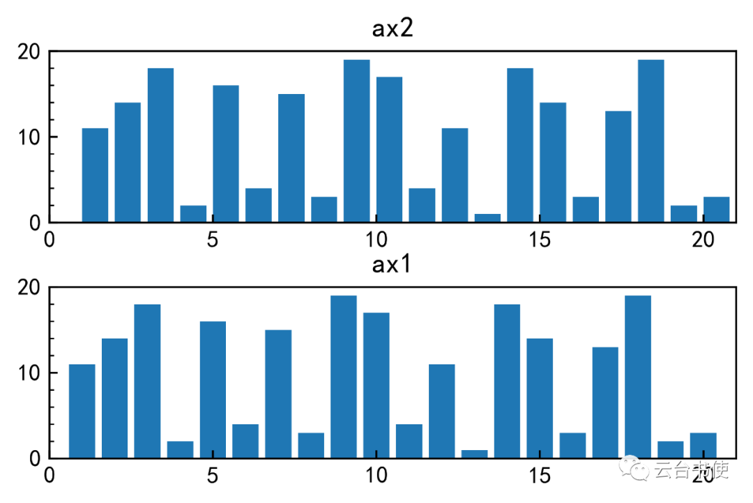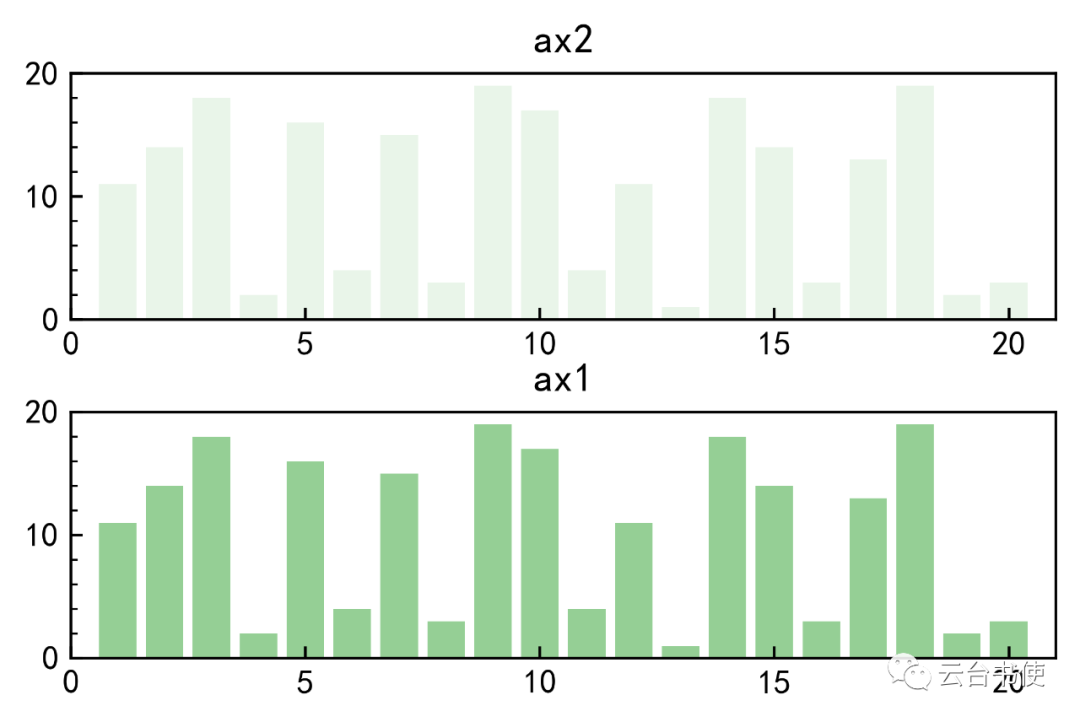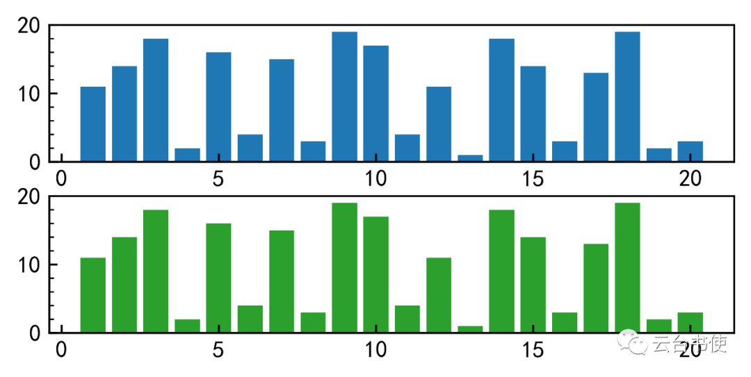 import matplotlib.pyplot as pltimport numpy as npimport matplotlib.ticker as mtickerplt.rcParams['font.sans-serif']=['SimHei']#中文plt.rcParams['axes.unicode_minus']=False#负号def sample_data():#拟造数据x=np.array([1,2,3,4,5,6,7,8,9,10,11,12,13,14,15,16,17,18,19,20])y=np.array([11,14,18,2,16,4,15,3,19,17,4,11,1,18,14,3,13,19,2,3])return x,yx,y=sample_data()#获得数据fig=plt.figure(figsize=(4,2),dpi=500)#添加画布ax1=fig.add_axes([0,0,1,0.4])#添加子图ax2=fig.add_axes([0,0.5,1,0.4])ax1.bar(x,y,color='tab:green')ax2.bar(x,y,color='tab:blue')#############下面是针对图表刻度等细节的修改##############ax1.set_ylim(0,20)ax1.tick_params(axis='both',which='both',direction='in')ax1.xaxis.set_major_locator(mticker.MultipleLocator(5))ax1.yaxis.set_minor_locator(mticker.MultipleLocator(2))ax2.set_ylim(0,20)ax2.tick_params(axis='both',which='both',direction='in')ax2.xaxis.set_major_locator(mticker.MultipleLocator(5))ax2.yaxis.set_minor_locator(mticker.MultipleLocator(2))plt.show()