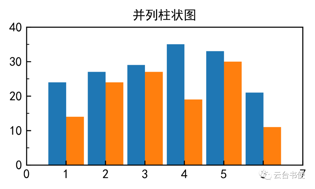 fig=plt.figure(figsize=(3,1.5),dpi=600)#添加画布等ax=fig.add_axes([0,0,1,1])bar1=ax.bar(x2-0.22,y4,width=0.45)bar2=ax.bar(x2+0.23,y5,width=0.45)ax.set_title('并列柱状图',fontsize=10)ax.set(xlim=(0,7),ylim=(0,40))ax.tick_params(axis='both',which='both',direction='in')ax.yaxis.set_minor_locator(mticker.MultipleLocator(5))