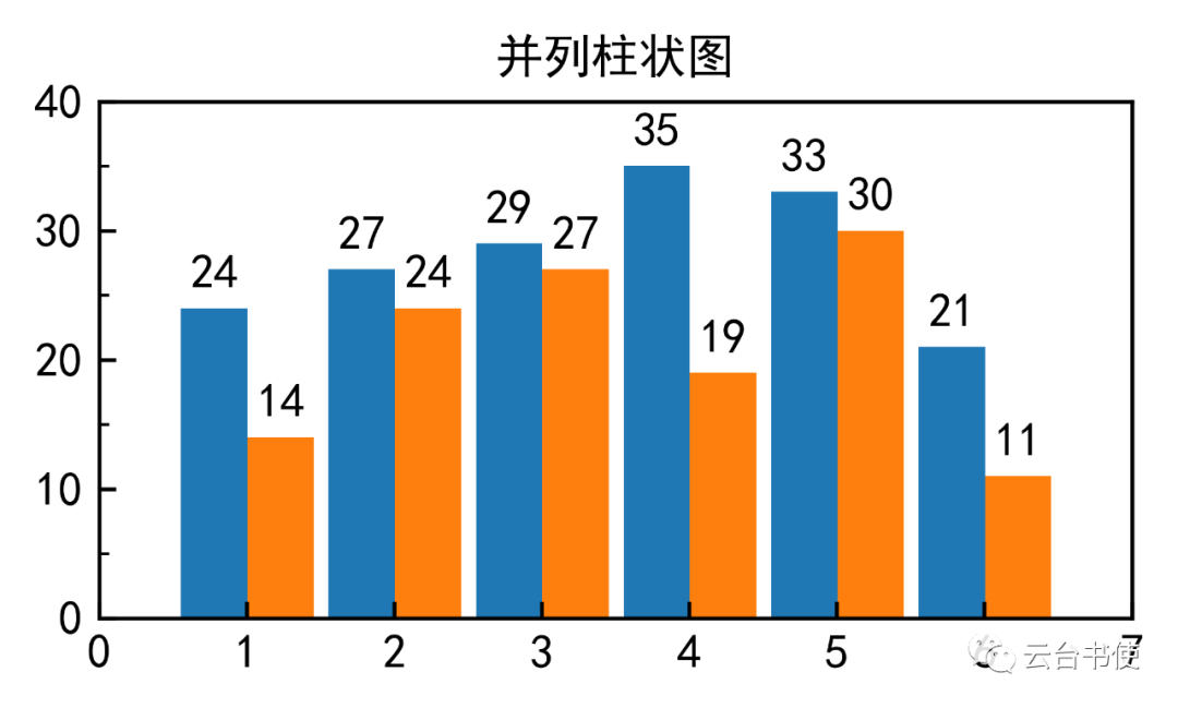 fig=plt.figure(figsize=(3,1.5),dpi=600)#添加画布等ax=fig.add_axes([0,0,1,1])bar1=ax.bar(x2-0.22,y4,width=0.45)bar2=ax.bar(x2+0.23,y5,width=0.45)ax.set_title('并列柱状图',fontsize=10)ax.set(xlim=(0,7),ylim=(0,40))ax.tick_params(axis='both',which='both',direction='in')ax.yaxis.set_minor_locator(mticker.MultipleLocator(5))def autolabel(rects):for rect in rects:height = rect.get_height()ax.annotate('{}'.format(height),xy=(rect.get_x() + rect.get_width() / 2, height),xytext=(0, 3), # 3 points vertical offsettextcoords="offset points",ha='center', va='bottom')autolabel(bar1)autolabel(bar2)