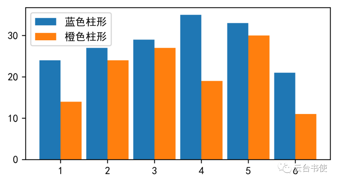 fig=plt.figure(figsize=(4,2),dpi=600)#添加画布等ax=fig.add_axes([0,0,1,1])width=0.45bar1=ax.bar(x2-width/2,y4,width)bar2=ax.bar(x2+width/2,y5,width)ax.legend([bar1,bar2],['蓝色柱形','橙色柱形'])