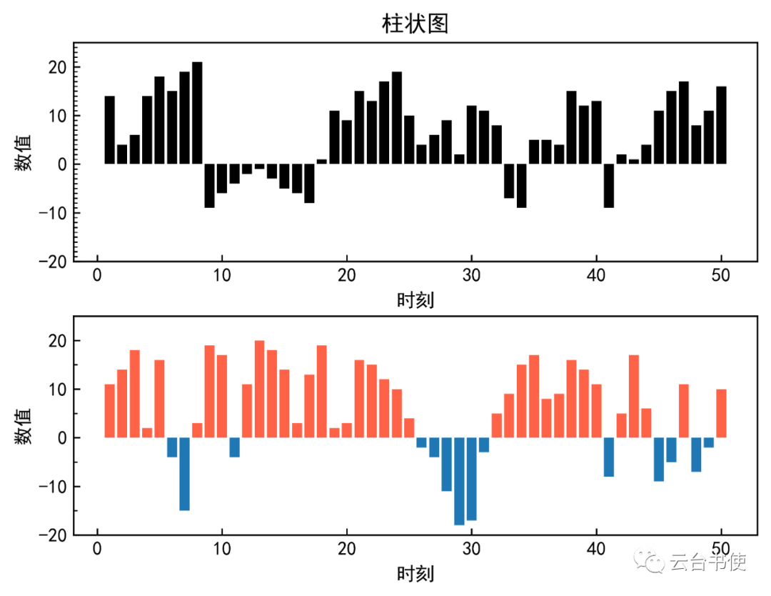 import matplotlib.pyplot as pltimport numpy as npimport matplotlib.ticker as mtickerplt.rcParams['font.sans-serif']=['SimHei']#中文plt.rcParams['axes.unicode_minus']=False#负号def sample_data():#拟造数据x=np.array([1,2,3,4,5,6,7,8,9,10,11,12,13,14,15,16,17,18,19,20,21,22,23,24,25,26,27,28,29,30,31,32,33,34,35,36,37,38,39,40,41,42,43,44,45,46,47,48,49,50])x2=np.array([1,2,3,4,5])y1=np.array([11,14,18,2,16,-4,-15,3,19,17,-4,11,20,18,14,3,13,19,2,3,16,15,12,10,4,-2,-4,-11,-18,-17,-3,5,9,15,17,8,9,16,14,11,-8,5,17,6,-9,-5,11,-7,-2,10])y2=np.array([14,4,6,14,18,15,19,21,-9,-6,-4,-2,-1,-3,-5,-6,-8,1,11,9,15,13,17,19,10,4,6,9,2,12,11,8,-7,-9,5,5,4,15,12,13,-9,2,1,4,11,15,17,8,11,16])y3=np.array([1120,1230,1190,1340,1590,1180,1390,1520,1690,1370,1210,1550,1555,1320,1221,1421,1321,1532,1432,1222,1243,1543,1121,1672,1389,1567,1678,1224,1521,1790,1810,1146,1356,1455,1789,1567,1234,1120,1675,1879,1800,1567,1235,1786,1346,1345,1789,1435,1567,1333])y4=np.array([24,27,29,35,33,21])y5=np.array([14,24,27,19,30])return x,x2,y1,y2,y3,y4,y5x,x2,y1,y2,y3,y4,y5=sample_data()#获得数据fig=plt.figure(figsize=(5,4),dpi=600)#添加画布等ax1=fig.add_axes([0,0,1,0.4])ax2=fig.add_axes([0,0.5,1,0.4])ax1.bar(x,y1,color=np.where(y1>0,'tomato','tab:blue'))ax2.bar(x,y2,color='k')ax1.set_ylim(-20,25)ax1.tick_params(axis='both',which='both',direction='in')ax1.yaxis.set_minor_locator(mticker.MultipleLocator(5))ax1.set_xlabel('时刻')ax1.set_ylabel('数值')ax2.set_ylim(-20,25)ax2.tick_params(axis='both',which='both',direction='in')ax2.yaxis.set_minor_locator(mticker.MultipleLocator(1))ax2.set_xlabel('时刻')ax2.set_ylabel('数值')plt.title('柱状图')plt.savefig('a',bbox_inches='tight')plt.show()