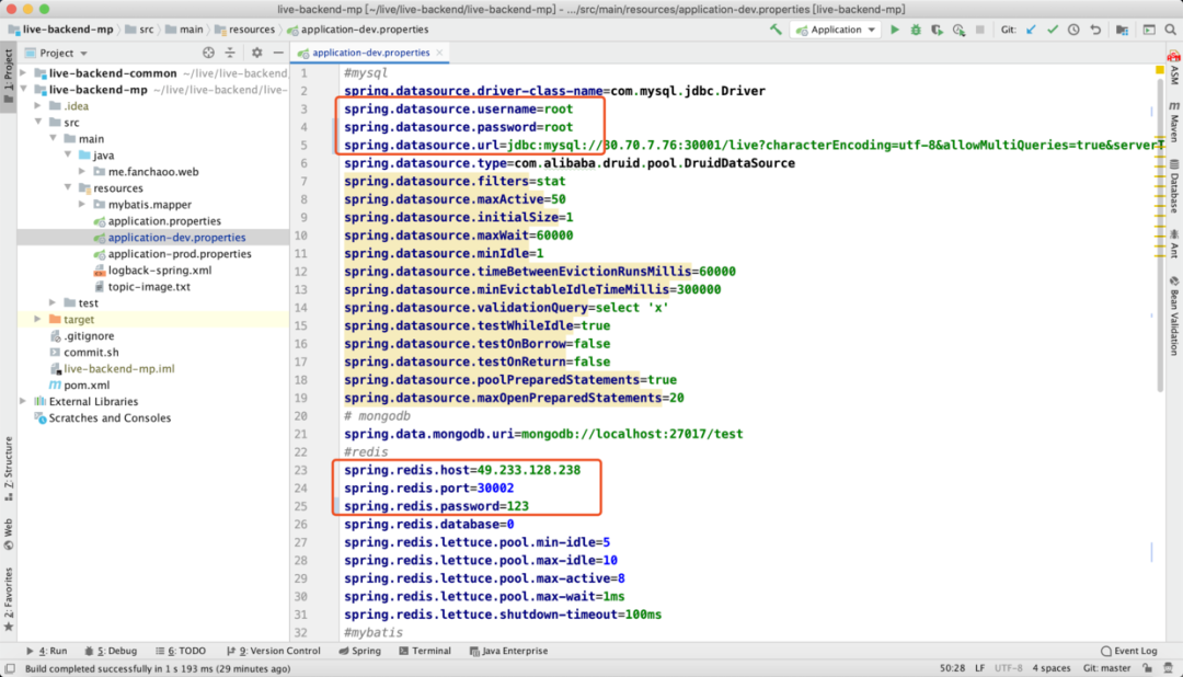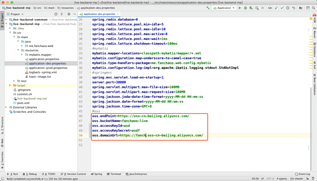 3、修改 application-dev 中的 MySQL,Redis,阿里云 OSS 配置