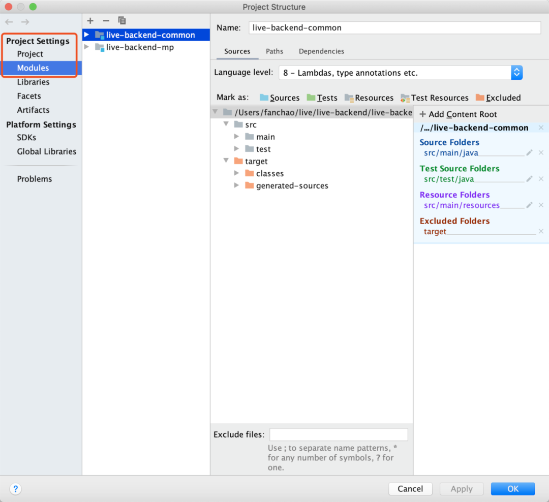 2、使用 IDEA 导入 live-backend-mp 项目,并通过 Modules 的方式导入 live-backend-common 项目