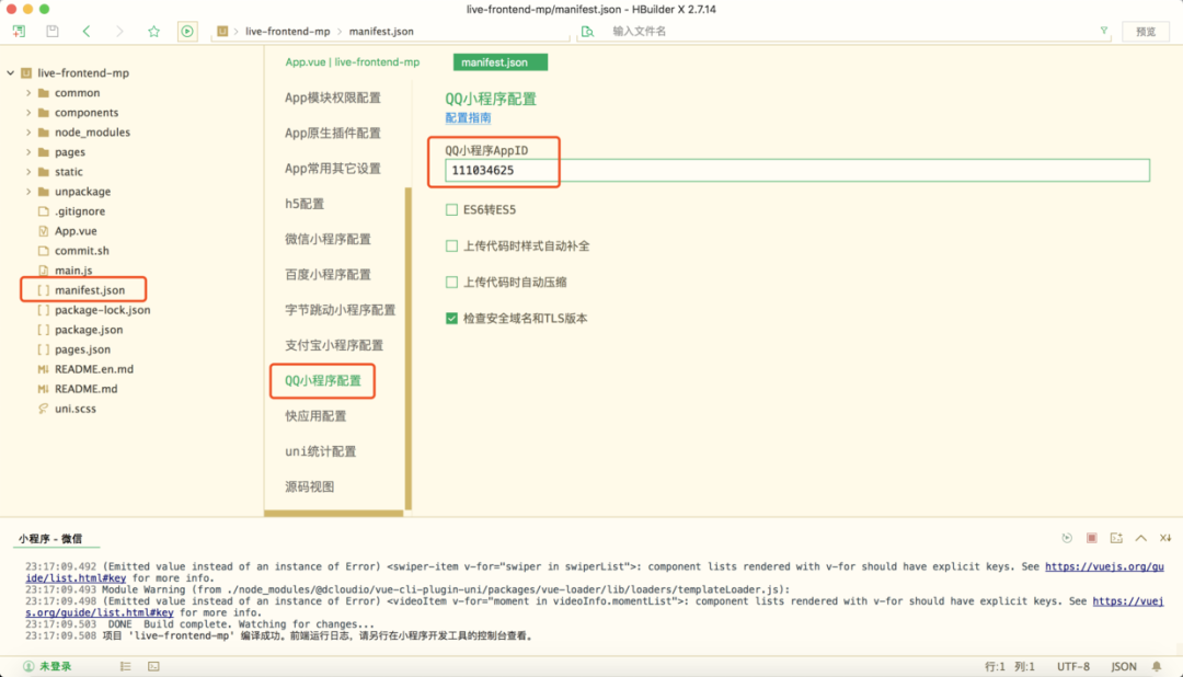 2、修改 manifest.json 的 APPID 配置(微信小程序或 QQ 小程序)