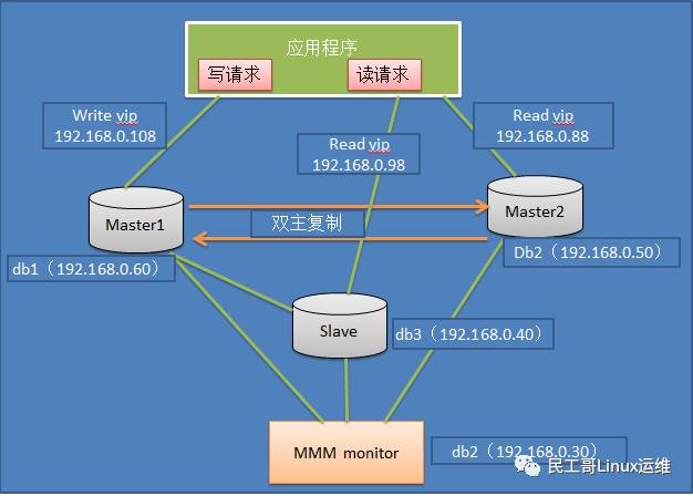 MMM即Master-Master Replication Manager for MySQL(mysql主主复制管理器),是关于mysql主主复制配置的监控、故障转移和管理的一套可伸缩的脚本套件(在任何时候只有一个节点可以被写入),这个套件也能基于标准的主从配置的任意数量的从服务器进行读负载均衡,所以你可以用它来在一组居于复制的服务器启动虚拟ip,除此之外,它还有实现数据备份、节点之间重新同步功能的脚本。