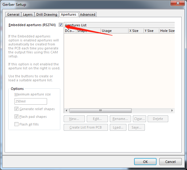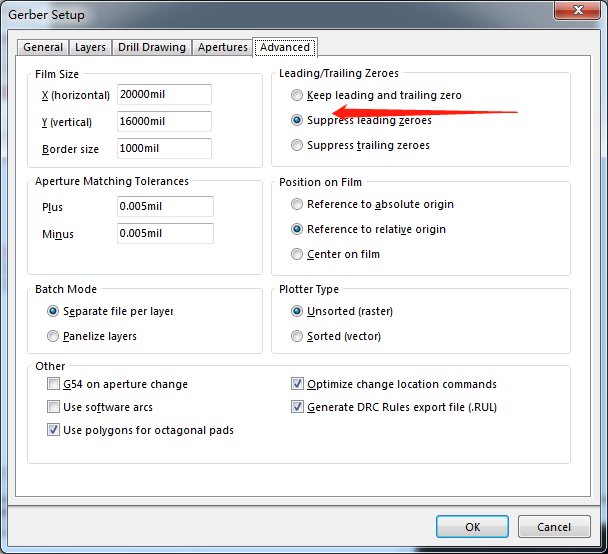 “光圈”中将“嵌入的光圈(RS274X)”打上√即可。在“高级”里面,选中“Suppress leading zeroes(抑制前导零字符)”,其他设置不变。点击“确定”。第一次输出,至此第一大步完成。(第一步生成的.cam可不用保存)