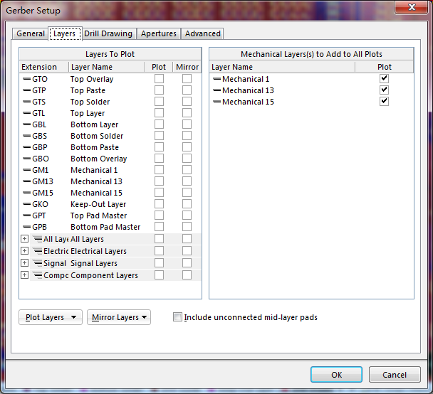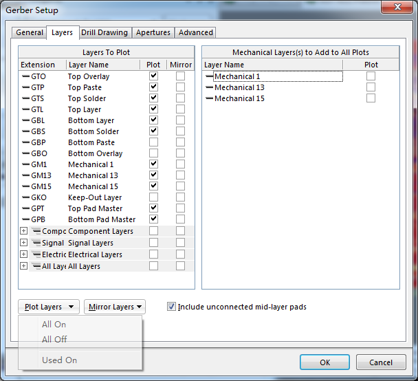 1、在PCB文件环境中,再次进入Gerber设置界面,有“层”中,“画线层”和“映射层”全部“All Off”,“包括未连接的中间层焊盘”也不选中,只选中左边与板子外框有关的机械层。(与第一次设置取反)