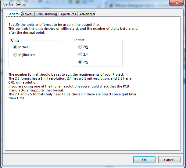 在PCB文件环境中,点击文件->制造输出->Nc Drill Files进行钻孔设置。单位为英寸,格式为2:5,选择“Suppress leading zeroes”。和前面的设置都保持一致,其他选项不变。点击“确认”进行第三次输出,在弹出的“输入钻孔数据”界面点击左键确认输出(.cam可不保存)。