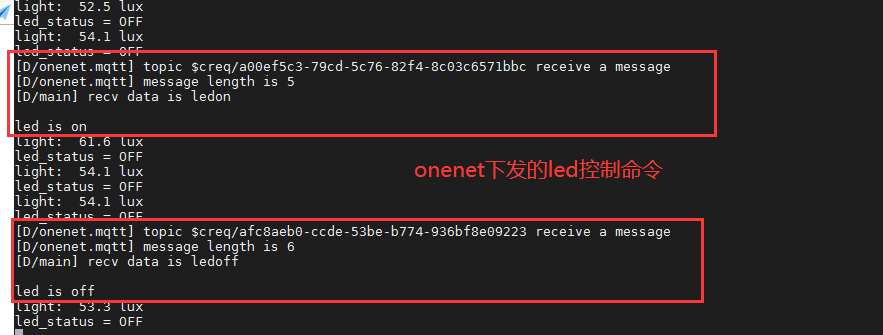 我们收到onenet下发的命令之后,所需要做的操作放在这里面。比如当我们的设备接收到ledon字符串时,打开led,并打印提示信息。最后再把led is on信息应答给onenet。