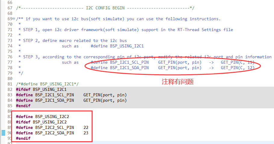 这里我用的是RT-Thread Studio V1.1.0,这里的I2C的范例配置有点问题,其它版本的RT-Thread Studio应该可以按范例配置那么配,如果按范例配置编译不通过的话可以按照I2C2那样配置。