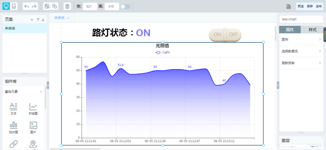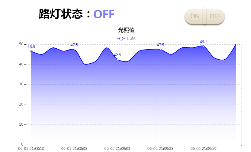 实验说明:设备终端不断采集光强数据并上传至云端进行监控,同时也会把当前LED(路灯)的状态上传。LED的状态会根据光照值进行打开、关闭。