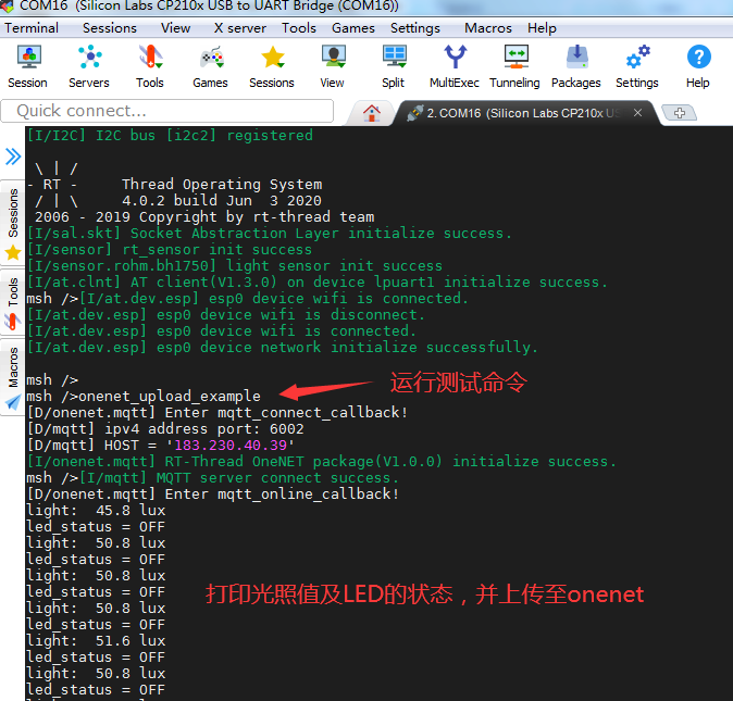 这是我们的上传任务:读取BH1750传感器采集的光照值,通过onenet软件包给我们提供的onenet_mqtt_upload_string接口上传至onenet。