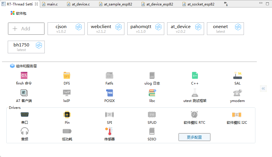 本实验我们需要用到RT-Thread的BH1750软件包、OneNet软件包及at_device软件包等。这些软件包的使用已经在前两篇笔记中有写到: