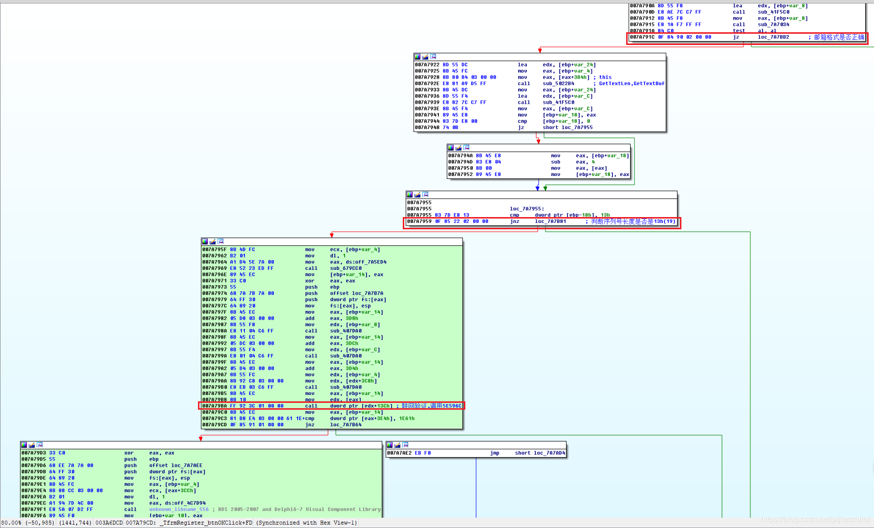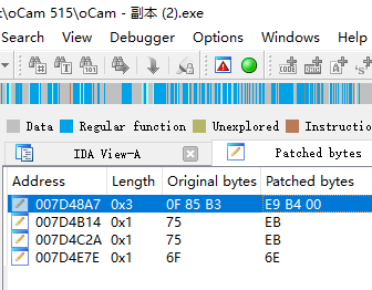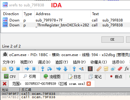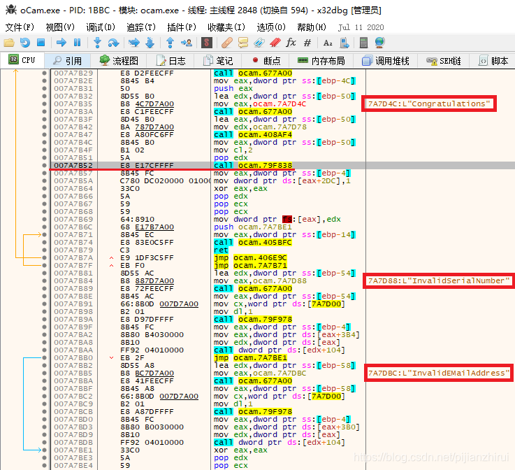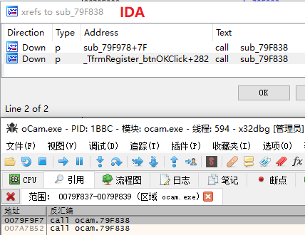 oCam为Delphi开发,未注册版的主界面下方会有广告,关闭主界面后会出现一个弹窗,这个弹窗要等待3秒才能关闭,关闭弹窗后又会在默认浏览器中打开他们的网站。如果直接用OllyDbg或者x32dbg打开oCam.exe,然后用F8单步执行,若不加任何断点,要不了几步就会提示“已停止,调试结束”,这是oCam刻意加入的反调试技术,可能和812C75处的CreateMutexW有关,我没有深入研究,采取另外一种方法绕过:直接启动oCam,然后用OllyDbg或x32dbg去附加,(使用x32dbg时要注意勾选 调试>高级>隐藏调试器(PEB),否则容易出现异常)。附加后,点击菜单>注册,电子邮箱和序列号随便填,比如都填1,点击“确定”会报“无效的邮件地址”,把邮箱地址改为1@x.com,再点“确定”就会报“无效用户名或注册码”,在报错的同时也会有系统提示音。这个提示音就是PoJie的起点。使用bp MessageBeep命令下断点,点击“确定”后观察栈的内容,可以找到来自79F8A3的调用。79F8A3下方不远处(79F8B2)又有对CreateMessageDialog的调用,说明79F8A3和79F8B2所在的函数79F838就是用来带提示音报错的,在IDA或x32dbg中查找对79F838的引用,发现只有两处引用,其中一处引用是_TfrmRegister_btnOKClick+282,这个函数名称的含义非常明显了。而x32dbg中则能看到"Congratulations"、"InvalidSerialNumber"、"InvalidEMailAddress"这3个字符串,于是判断序列号是否正确的函数一下子就找到了。