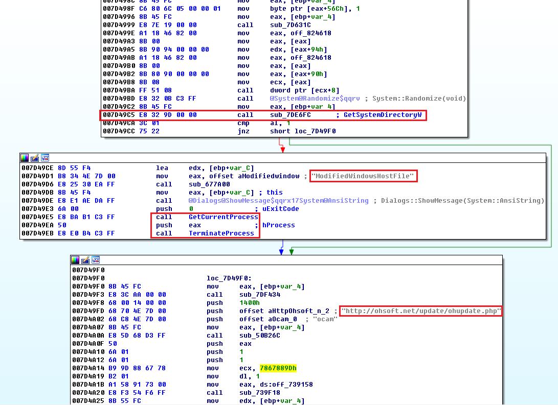 call sub_7DE6FC之后立刻就是cmp al,1和jnz short loc_7D49F0,如果跳转不发生(即检测到hosts文件被篡改),就会执行7D49E5 call GetCurrentProcess和7D49EB call TerminateProcess。那么我们可以把jnz short loc_7D49F0改成jmp short loc_7D49F0。或者不修改hosts文件,而是直接把7D4E70处的检查更新的网址给改掉,比如ohsoft改成nhsoft、update改成upupup等。上述两种方法都能去掉强制更新。