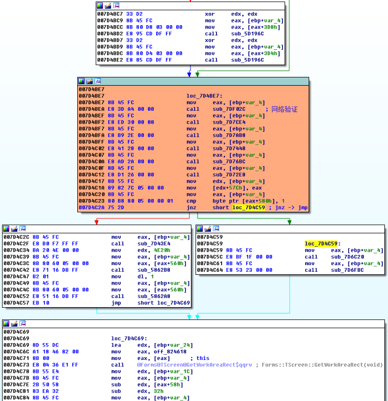 在_TfrmMain_FormCreate(7D4964)中继续向下看,7D4B68处又有一个TerminateProcess,无需多想,把它前面的7D4B14 jnz short loc_7D4B6D改成jmp short loc_7D4B6D肯定不会错。继续向下,7D4BEA处call sub_7DF02C,sub_7DF02C里面又有FF-FF-FF-FF-FF-FF和http://ohsoft.net/php/AuthManager/auth.php?value=,说明这个函数是在启动时联网检查序列号是否正确(此函数也是通过对引用……/auth.php网址的地方下断点找到的)。call sub_7DF02C之后不远处有一个跳转,7D4C2A jnz short loc_7D4C59,大胆猜测,这个跳转就是决定主窗体是否显示广告的地方,jnz改成jmp后,广告果然消失。
