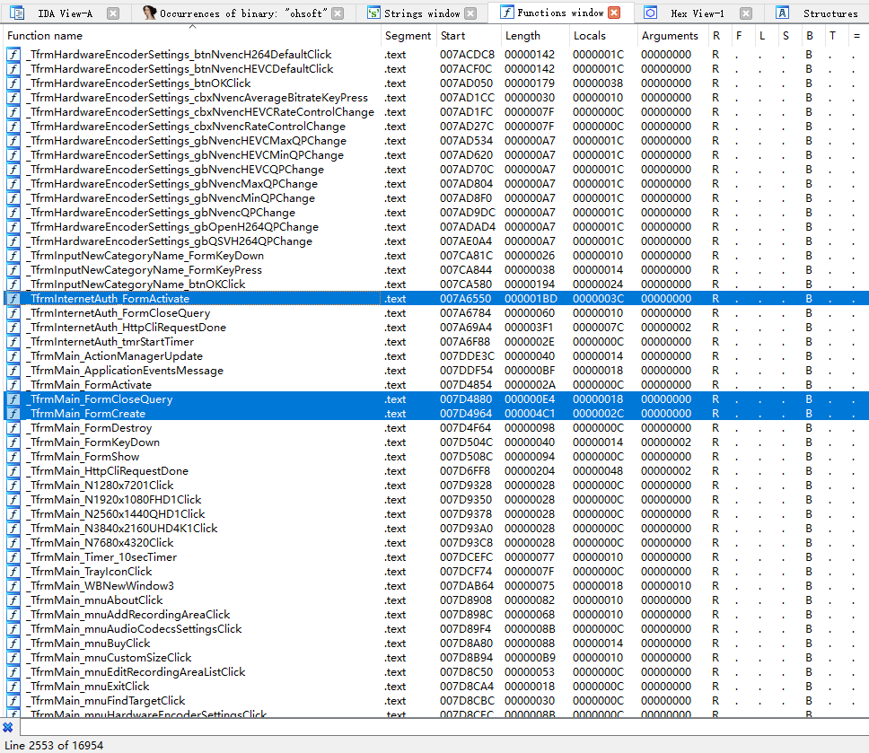 接下来当然是研究7A78D0(_TfrmRegister_btnOKClick)了,如果邮箱格式不正确,7A791C处就会跳到7A7BB2。7A7955处 cmp dword ptr [ebp-18h], 13h就是判断序列号的长度是不是13h(十进制19),若不是13h则会跳到7A7B81。经过一番调试,可发现7A79BA处 call dword ptr [edx+13Ch]是在联网验证序列号是否正确,运行时[edx+13Ch]=5E596C,再经过层层跳转会到达7A6550(_TfrmInternetAuth_FormActivate),在这个函数里又可以看到两个很显眼的字符串,FF-FF-FF-FF-FF-FF和http://ohsoft.net/php/AuthManager/register.php?value=,看到这个网址,很自然会想到搜索一下ohsoft的这个字符串,不仅要搜ASCII形式(单字节),还要搜Unicode形式(双字节),否则会有遗漏。还可搜出如下网址,