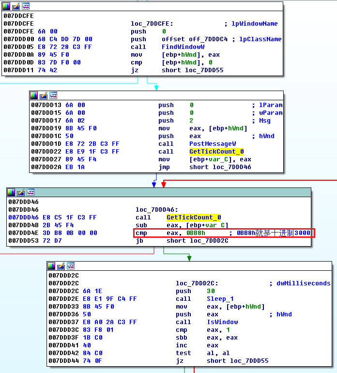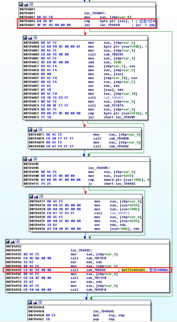 不过这样修改后,关闭主窗体后还是会有一个窗口弹出来,等待3秒才能关闭。前面已经发现了_TfrmMain_FormCreate之类的含义明确的名称,那么在IDA的Functions窗口(快捷键Shift + F3)肯定能找到更多有用的信息,不妨在其中搜索一下Close,很快就能看到_TfrmMain_FormCloseQuery(7D4880),用OllyDbg或者x32dbg附加后在7D4880处下断点,调试一番可以发现,7D4949处call sub_7DDCDC,sub_7DDCDC里面调用了GetTickCount(获取自系统启动以来经过的毫秒数),还有两处cmp eax, 0BB8h,BB8h化成十进制正好是3000,这就是等待3秒(3000ms)的源头,所以不能执行call sub_7DDCDC。把7D48A4处的cmp byte ptr [eax], 1改成cmp byte ptr [eax], 0,或者把紧接着的7D48A7 jnz loc_7D4960改成jmp loc_7D4960,就大功告成了。