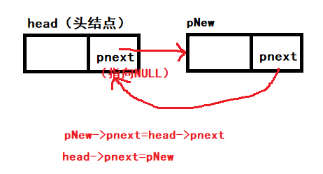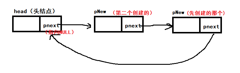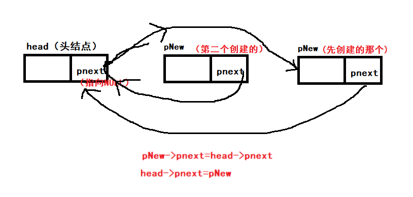 由于head->pnext指向先创建的pNew,那么令第二次创建的pNew->pnext=head->pnext,而head->pnext又指向先创建的pNew,于是先创建的pNew和后创建的pNew就连接起来了。