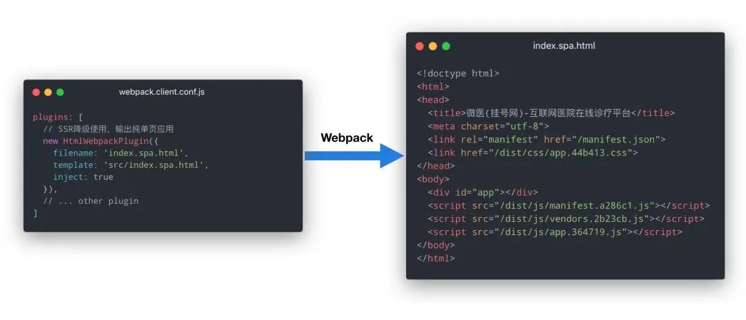 接着介绍一下 SSR 降级机制的实现原理。首先如果要实现这样一套降级机制,我们得在构建客户端代码的时候生成一个 SPA 应用:
