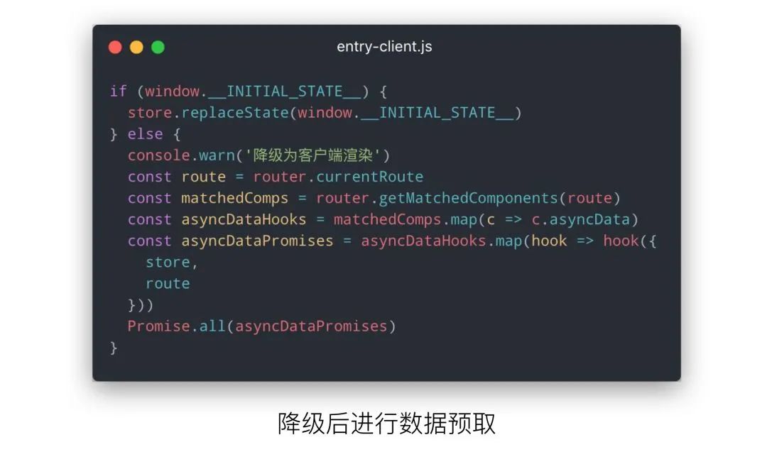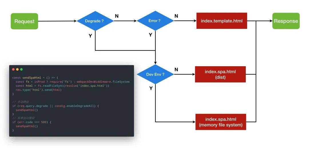 一开始是正常的服务端渲染 ,接着在 URL 中带上一个 degrade 参数后,服务端会返回一个 SPA 应用。然后我模拟了 asyncData 中接口异常的情况,可以发现服务端也返回了一个 SPA 应用,而不是一个 500 的异常页面。