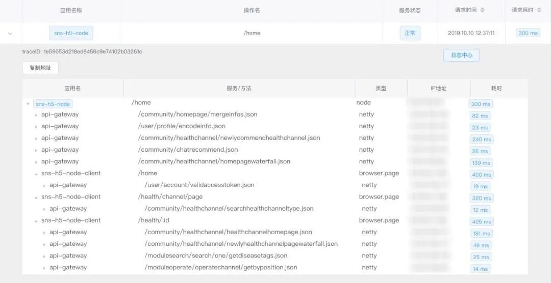 上面这张图是 Node.js 应用接入到这套链路追踪系统后的链路图,可以非常清晰的看到在服务端调用了哪些接口,甚至配合 Browser 端的 SDK 可以将 SSR 应用的链路链接起来,进行用户页面访问路径、内容到达时间、页面性能的分析。