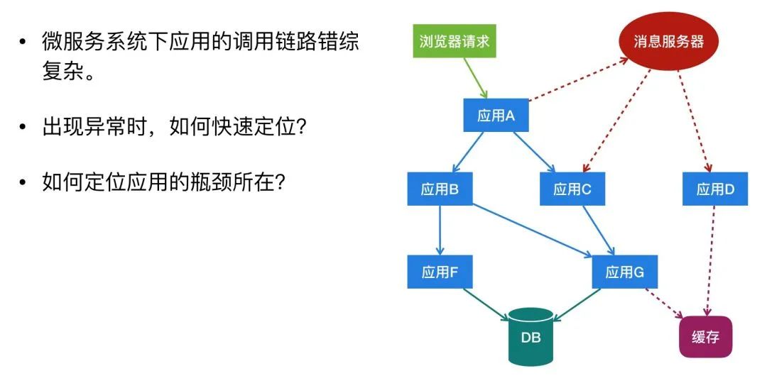 在现代化的微服务系统中,客户端的一次请求操作,可能需要经过系统中多个模块,如何确定客户端的一次操作背后调用了哪些应用,经过了哪些节点,先后顺序是怎样的?当出现 BUG 时,如何快速的定位问题出现在哪一环?还有每个应用的性能如何,耗时有多长,我们如何快速定位应用的瓶颈所在?