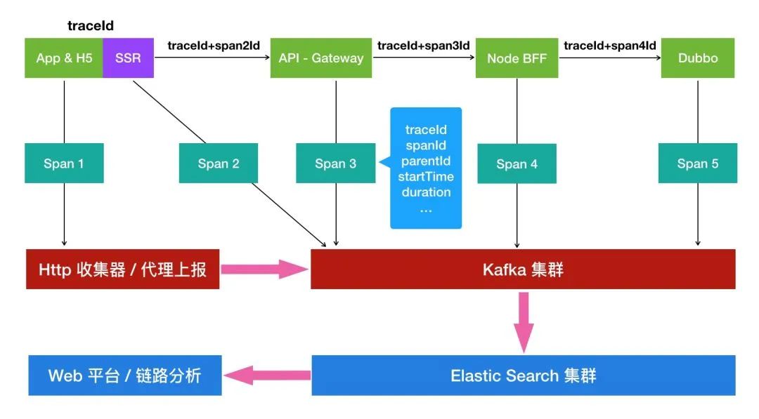 Node.js 和 Java 层面都是通过 Kafka 生产者将数据上报到消息队列里面。客户端需要做特殊的处理,因为客户端的应用协议比较单一,一般是 HTTP,所以不支持消息队列上报,需要加一层代理层。ES 负责消费数据,进行链路的分析,最后由 Web 平台进行链路的展示。
