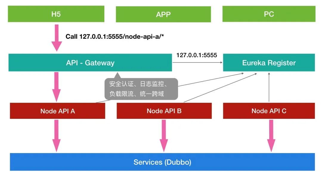 上面这张图展示了 Node.js 在整个微服务架构中的位置,最上层的是一些端应用,当一个请求发起时首先会经过 Java 的网关,网关作为微服务的唯一入口,进行请求的分发和通用逻辑的处理,网关下面是一些 API 服务,用来提供 HTTP 接口,最底层是更加原子化、细粒度的 Dubbo 服务。Eureka 是网关和 API 层的注册中心,Zookeeper 是 Dubbo 层的注册中心。Node.js 在 API 层主要做了以下工作。
