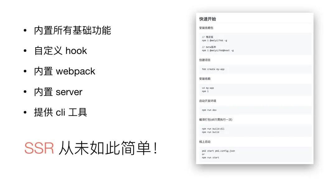 我们将这套 SSR 解决方案封装成一个内部框架、来更好的支持需求的迭代。出于框架可维护性、可升级性的考虑,我们将 Webpack 和 Server 部分都内置了进去,但同时也暴露了方法让用户做一些自定义的操作(webpack-chain、middleware等)。