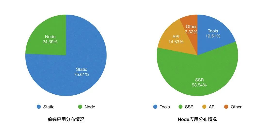 可以看到,集团总体前端应用中,Node.js 应用大概占比 1/4,而在 Node.js 应用中主要是 SSR 应用,其次是一些全栈体系的内部应用,接着是一些 API 服务,做一些接口的聚合和转发。