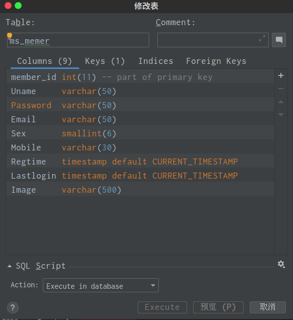 | 注册时间 | Regtime | timestamp | NOT NULL | |||