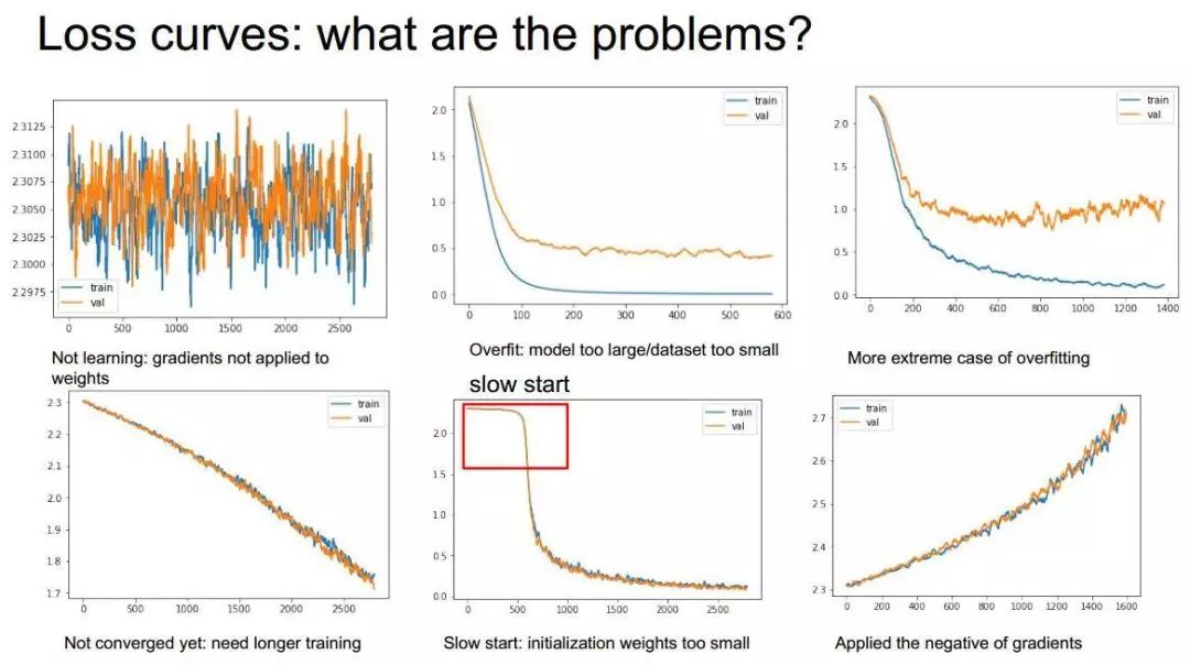 上图中,左上角的图像是显然的学习不到任何东西(可能这样看起来比较困难,可以适当smooth一下),而第二个则是典型的过拟合现象;第三个是更严重的过拟合;第四个损失值没有趋于平稳,很有可能是没有训练够;第五个经历了比较长的iterate才慢慢收敛,显然是初始化权重太小了;而最后一个越学习损失值越大,很有可能是“梯度向上”了。