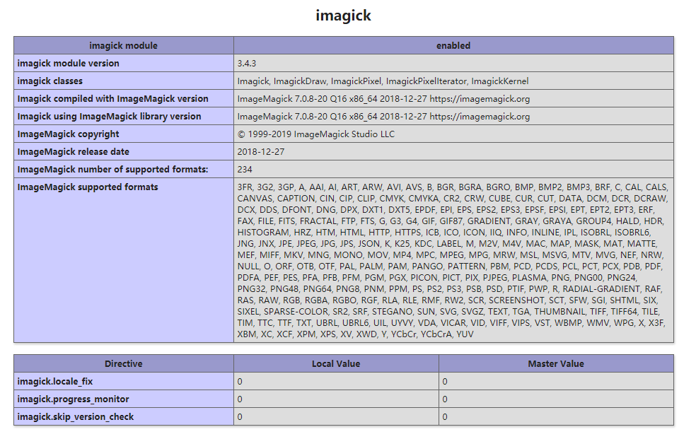#imagick模块介绍 ImageMagick是一个用于查看、编辑位图文件以及进行图像格式转换的开放源代码软件套装。它可以读取、编辑超过100种图象格式,可用来替换GD库。 #安装 在加载模块前要装好php 与nginx,参考https://www.cnblogs.com/huandada/p/10114722.html ##编译安装ImageMagick wget https://www.imagemagick.org/download/ImageMagick.tar.gz tar -xvf ImageMagick.tar.gz cd ImageMagick-7.0.8-20/ ./configure -prefix=/usr/local/imagemagick sudo make sudo make install ##php端imagick模块扩展 wget http://pecl.php.net/get/imagick-3.4.3.tgz tar -xvf imagick-3.1.2.tgz cd imagick-3.1.2 /usr/local/php/bin/phpize ./configure --with-php-config=/usr/local/php/bin/php-config --with-imagick=/usr/local/imagemagick sudo make make install后可以得到该模块扩展路径,之后这个路径会添加到php.ini