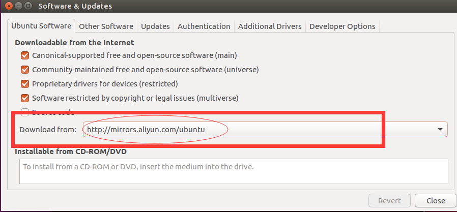 2. 打开"Software&Updates”,设置镜像源为mirrors.aliyun.com
