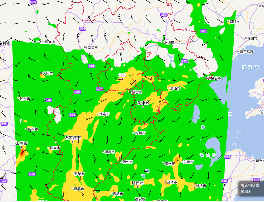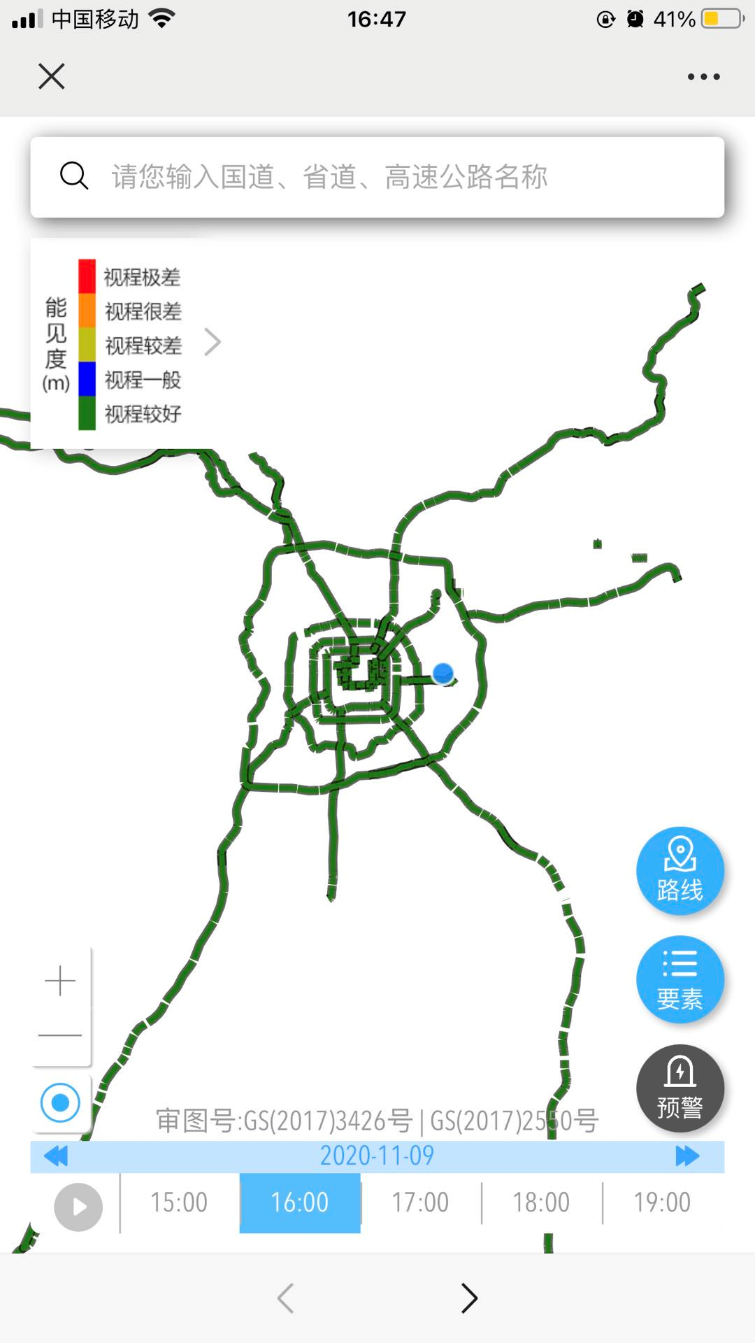 在“出行天气”微信产品中,应用RMAPS-CHEM模式中的能见度预报产品,叠加在京津冀的高速公路和主干道上,为公众出行提供交通气象服务;应用RMAPS-NOW中的分钟级降水预报产品叠加在京津冀的高速公路和交通主干道上,为公众出行提供降雨影响告警服务。