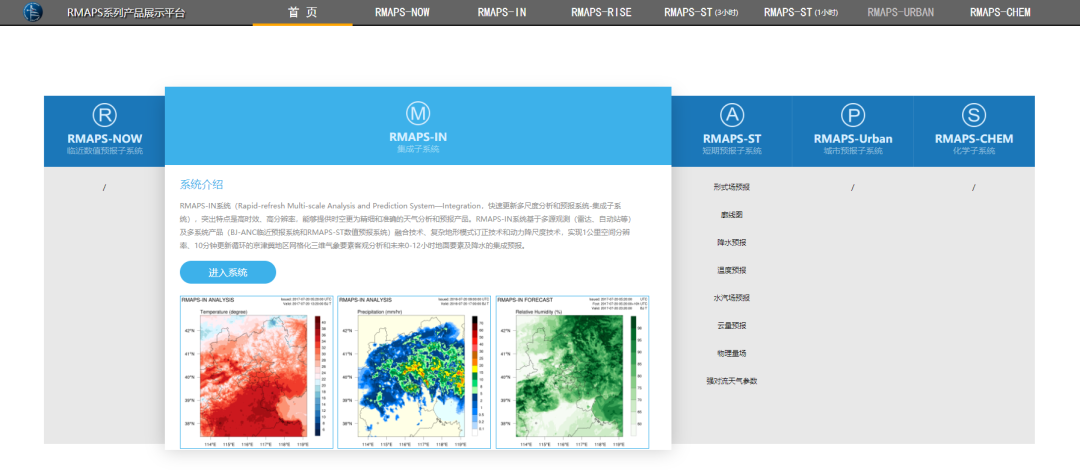 北京城市气象研究院(隶属北京市气象局)所研发的新一代快速更新多尺度资料分析和预报系统(RMAPS),包含短时数值预报子系统(RMAPS-ST)、集成子系统(RMAPS-IN)、临近数值预报子系统(RMAPS-NOW)、城市预报子系统(RMAPS-Urban)、化学子系统(RMAPS-CHEM)和冬奥子系统(RMAPS-RISE)六大部分,是个RMAPS家族。在公众气象服务中我们主要使用了ST、IN、NOW、CHEM,下面对这四个子系统做个简单介绍。如果想了解更多有关北京睿图模式研发进展,请关注北京城市气象研究院公众号:北京城市气象研究院。