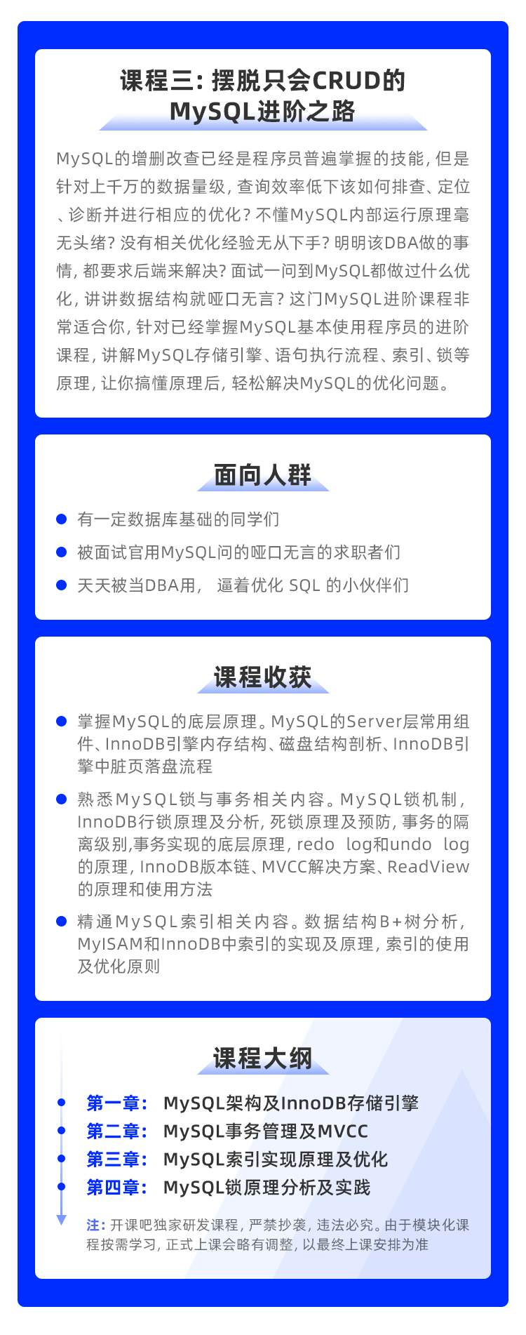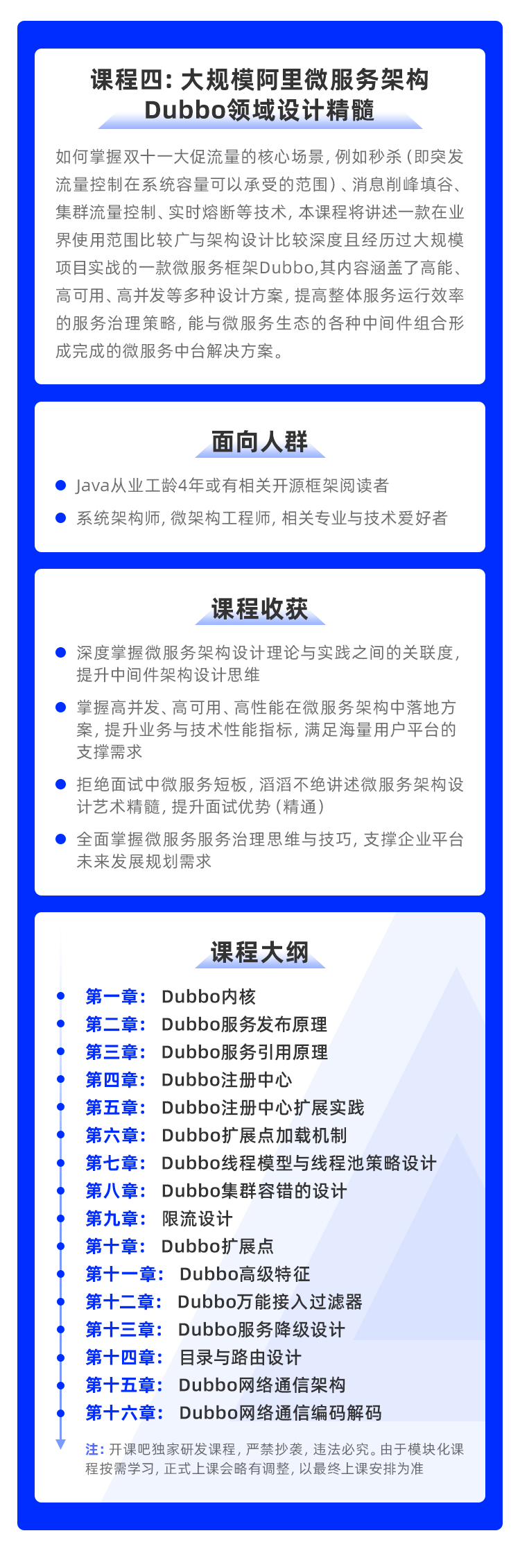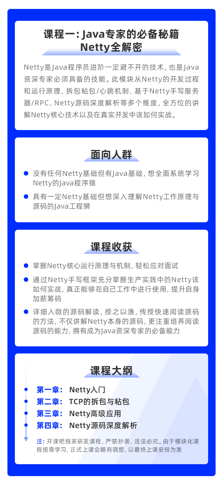 此模块课程是由开课吧联合一线名企师资,根据当前互联网发展与人才需求方向,数百位老师深入调研当前企业需求,聚焦当下火热的 Netty、K8S、MySQL、Dubbo,针对不同需求人群,精心迭代而成。一线名企项目全程案例贯穿,所学即所用;动图、动画展示原理、源码,快速高效进阶。