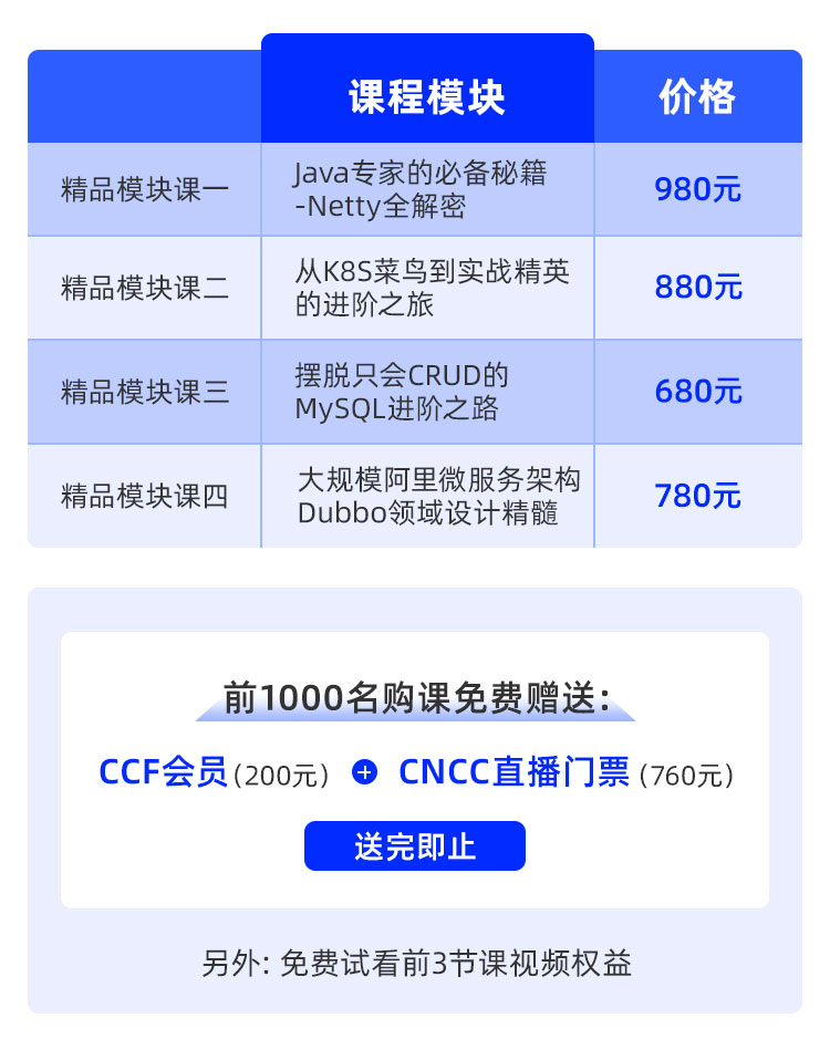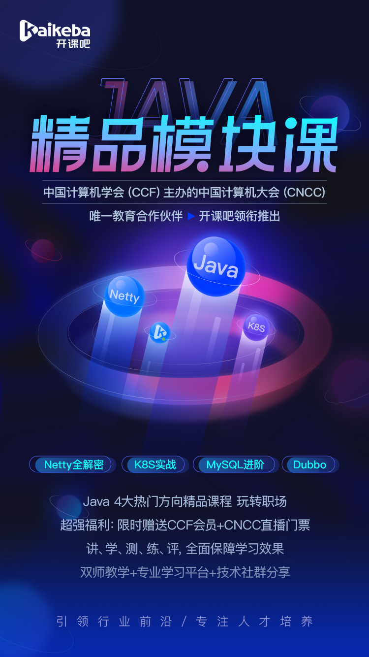 值此 CNCC 大会来临之际,开课吧作为其唯一的教育合作伙伴和金牌赞助商,为了回馈学员,现在购买《精品模块课》,前1000名将获得价值760元的CNCC直播门票+价值200元的CCF会员。